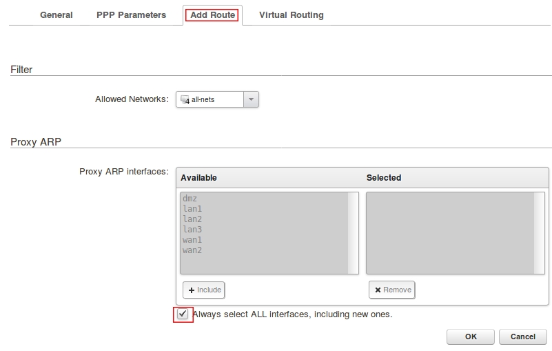 Перейдите на вкладку Add Route и включите Always select ALL interfaces, including new ones.