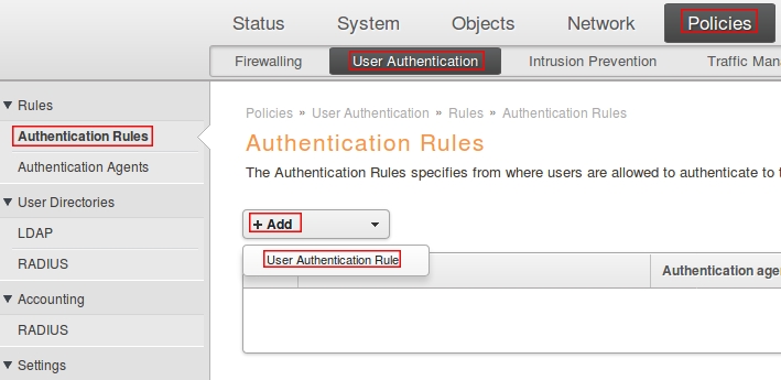 Пройдите в Web интерфейсе Policies → User Authentication → Authentication Rules, нажмите кнопку Add и выберите User Authentication Rules.