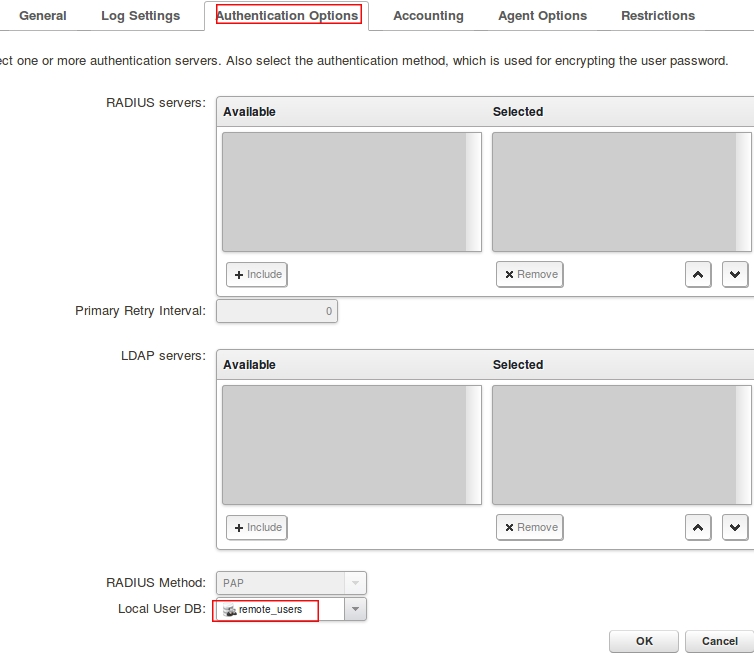 Перейдите во вкладку Authentication Options и в поле Local User BD укажите remote_users и нажмите кнопку Ок.