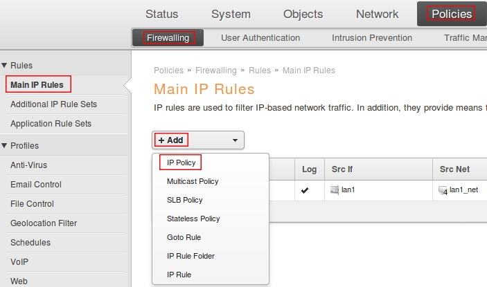 Пройдите в Web интерфейсе Policies → Firewalling → Main IP Rules, нажмите кнопку Add выберите IP Policy.