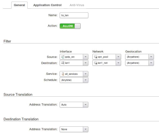 add IPPolicy Name=to_lan SourceInterface=pptp_srv SourceNetwork=vpn_pool DestinationInterface=lan1 DestinationNetwork=InterfaceAddresses/lan1_net Service=all_services Action=Allow
