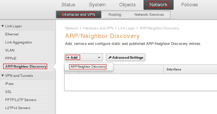 Пройдите в web интерфейсе Network → Interfaces and VPN → ARP/Neighbor Discovery, нажмите кнопку Add, и из выпадающего меню выберите ARP/Neighbor Discovery