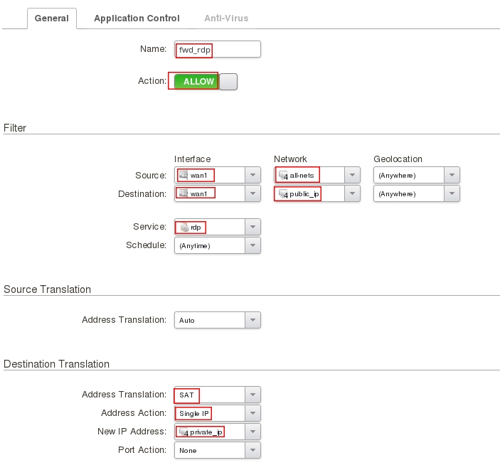 add IPPolicy Name=fwd_rdp SourceInterface=wan1 SourceNetwork=all-nets DestinationInterface=wan1 DestinationNetwork=InterfaceAddresses/wan1_ip Service=rdp