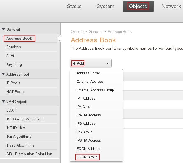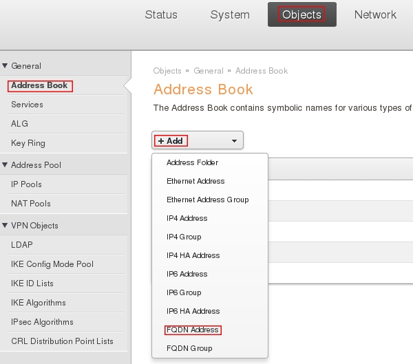 Пройдите в web интерфейсе Objects → Address Book, затем нажмите кнопку Add и из выпадающего меню выберите FQDN Address