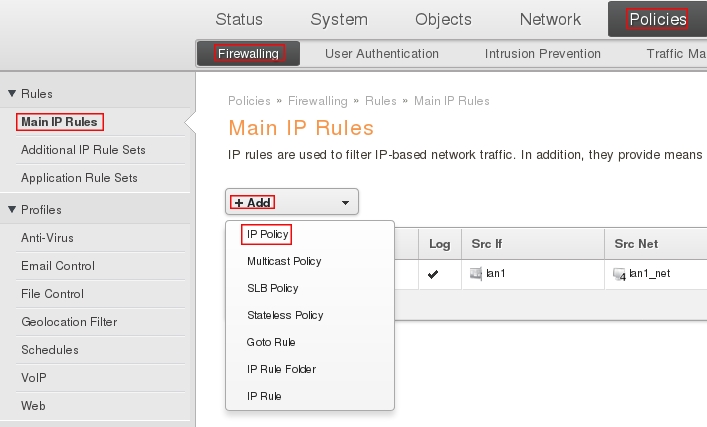 Пройдите в web интерфейсе Policies → Firewalling → Main IP Rules, затем нажмите кнопку Add и из выпадающего меню выберите IP Policy.