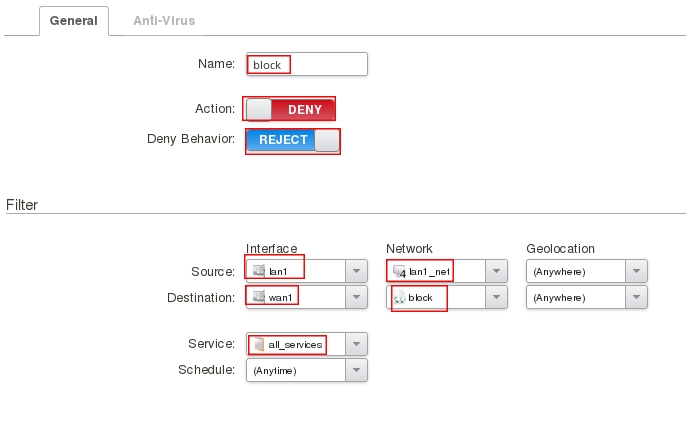 DestinationNetwork=block Service=all_services Action=Deny Reject=Yes