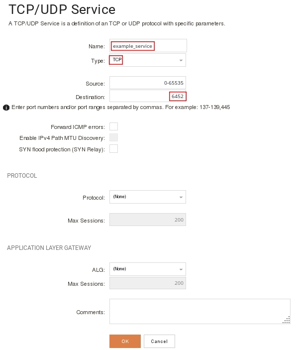 В поле Name укажите название сервиса (например, example_service), из выпадающего меню Type выберите TCP, в поле Destination укажите необходимый порт (примере 6452). нажмите кнопку ОК. Пример заполненных форм вы можете увидеть на скриншоте ниже: