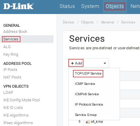 Пройдите в Web интерфейсе Objects → Services, нажмите кнопку Add и выберите TCP/UDP Service.