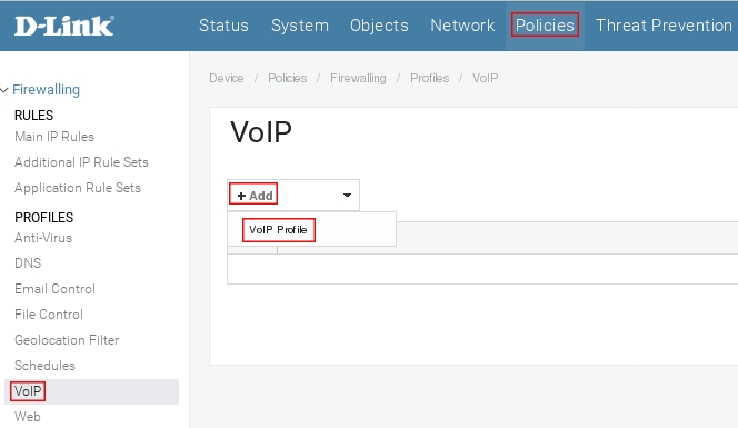 Пройдите в Web интерфейсе Policies → VoIP, нажмите кнопку Add и выберите VoIP Profile.