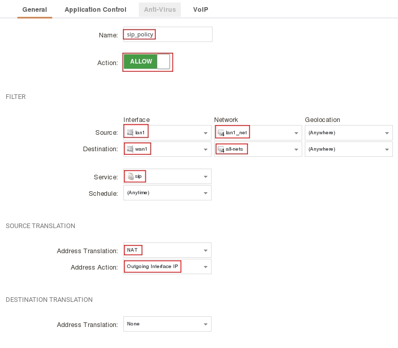 add IPPolicy Name=sip_policy Service=sip SourceInterface=lan1 SourceNetwork=InterfaceAddresses/lan1_net DestinationInterface=wan1 DestinationNetwork=all-nets Index=1 VoIP=Yes VoIP_Policy=sip SourceAddressTranslation=NAT
