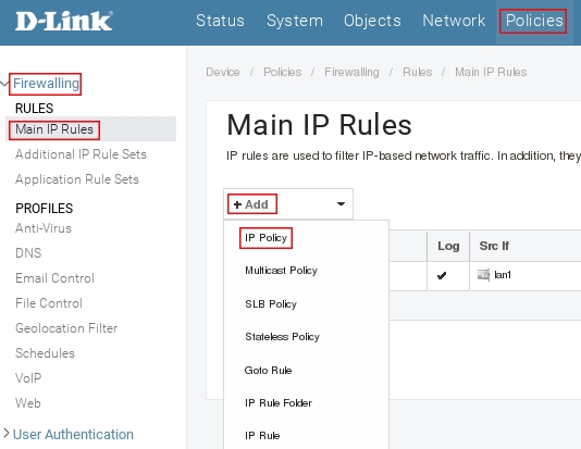 Пройдите в Web интерфейсе Policies → Firewalling → Main IP Rules нажмите на кнопку Add и выберите IP Policy.