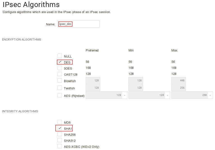 Пройдите на вкладку IKE (Phase-1) и в поле Algorithms укажите ike_des