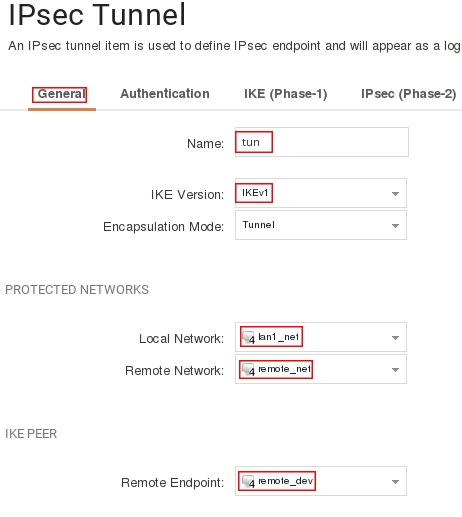 add Interface IPsecTunnel tun PSK=tunkey LocalNetwork=InterfaceAddresses/lan_net RemoteNetwork=remote_net RemoteEndpoint=remote_dev IKEAlgorithms=ike_des IPsecAlgorithms=ipsec_des