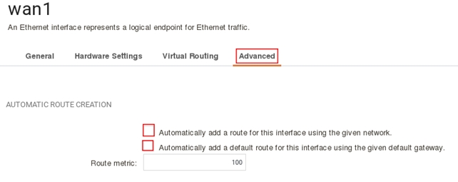 В настройках интерфейса wan1 во вкладке Advanced снимите галочки с Automatically add a route for this interface using the given network и Automatically add a default route for this interface using the given default gateway, а затем нажмите Oк.