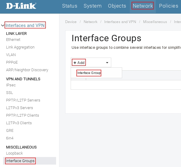 Пройдите в Web интерфейсе Network → Interfaces and VPN → Interface Group, затем нажмите кнопку Add и выберите Interface Group.