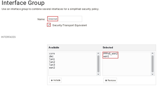 Назовите группу Internet, включите функцию Security/Transport Equivalent, выберите интерфейс wan1 и нажмите кнопку include, после чего повторите эти действия с интерфейсом PPPoE_wan2, после выполнения всех настроек нажмите Ок.