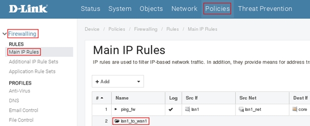 Пройдите в Web интерфейсе Policies →Firewalling → Main IP Rules → lan1_to_wan1