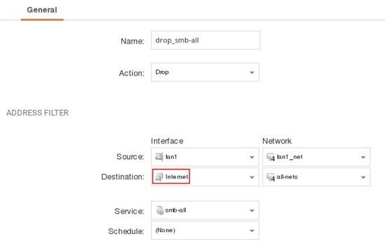 set IPRule 1(drop_smb-all) DestinationInterface=Internet