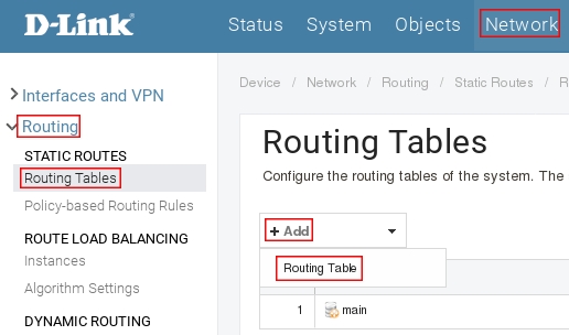 Пройдите в Web интерфейсе Network → Routing, затем нажмите на кнопку Add и выберите Routing Table.