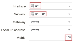 add route Interface=lan1 Network=InterfaceAddresses/lan1_net Metric=100