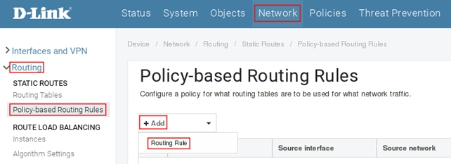 Пройдите в Web Network → Routin → Policy-based Routing rules, затем нажмите на кнопкку Add и выберите Routing Rules.