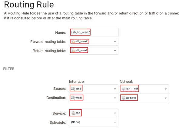 add RoutingRule SourceInterface=lan1 SourceNetwork=InterfaceAddresses/lan1_net DestinationInterface=wan1 DestinationNetwork=all-nets Service=ssh ForwardRoutingTable=alt_wan2 ReturnRoutingTable=alt_wan2 Name=ssh_to_wan2