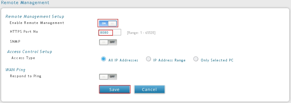 Включите Enable Remote Management, при необходимости поменяйте порт для удаленного доступа в поле HTTPS Port No. Если вы хотите ограничить адреса с которых можно получить удаленный доступ к устройству, то вы это можете сделать в разделе Access Control Setup. Для сохранения выполненных настроек нажмите кнопку SAVE.