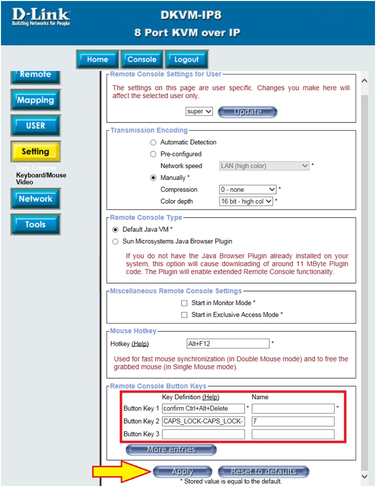 Шаг 3. В окне Remote Console Button Keys заполните следующие поля: